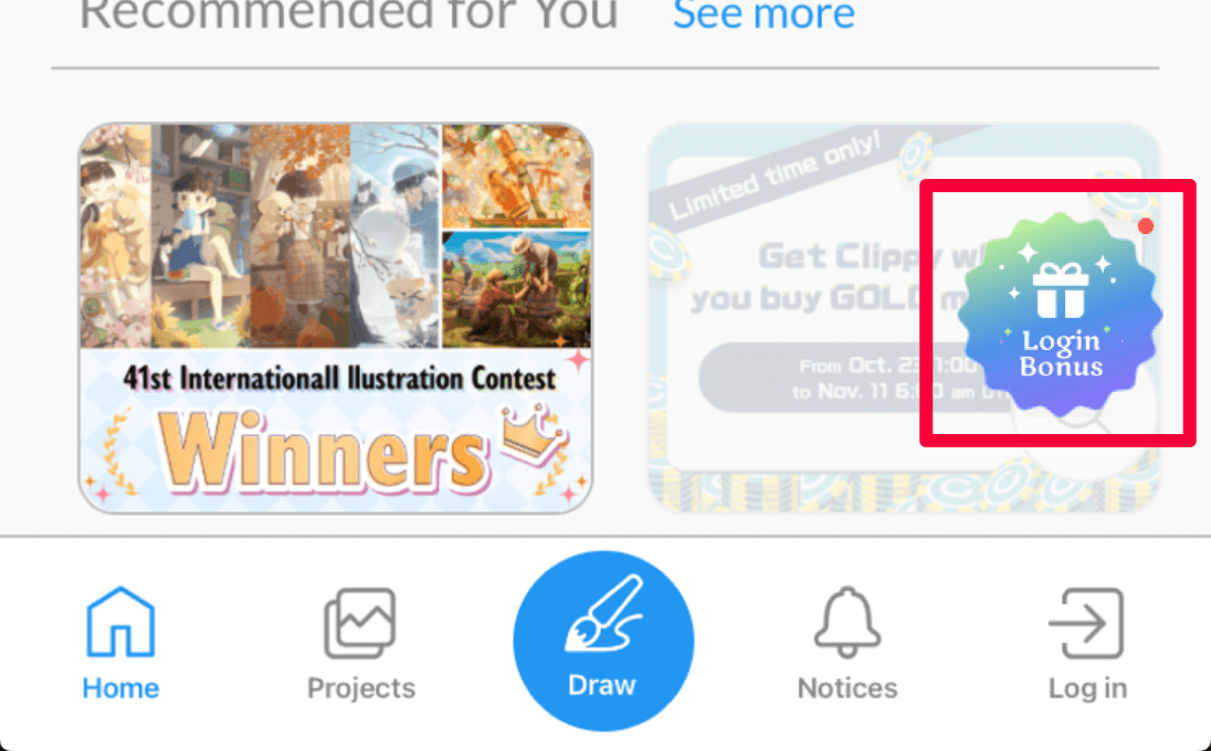 Launch the app, tap on “Login Bonus” on the home screen, and log in to your Clip Studio account.