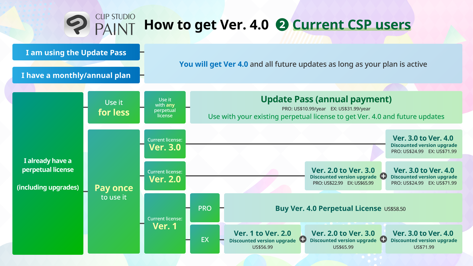 Current monthly/annual plan users and Update Pass users can update to Ver. 4.0 today. Users with perpetual licenses (Windows/macOS) for Ver. 3.0 or earlier can purchase an Update Pass add-on or get discounted upgrade(s) to Ver. 4.0.