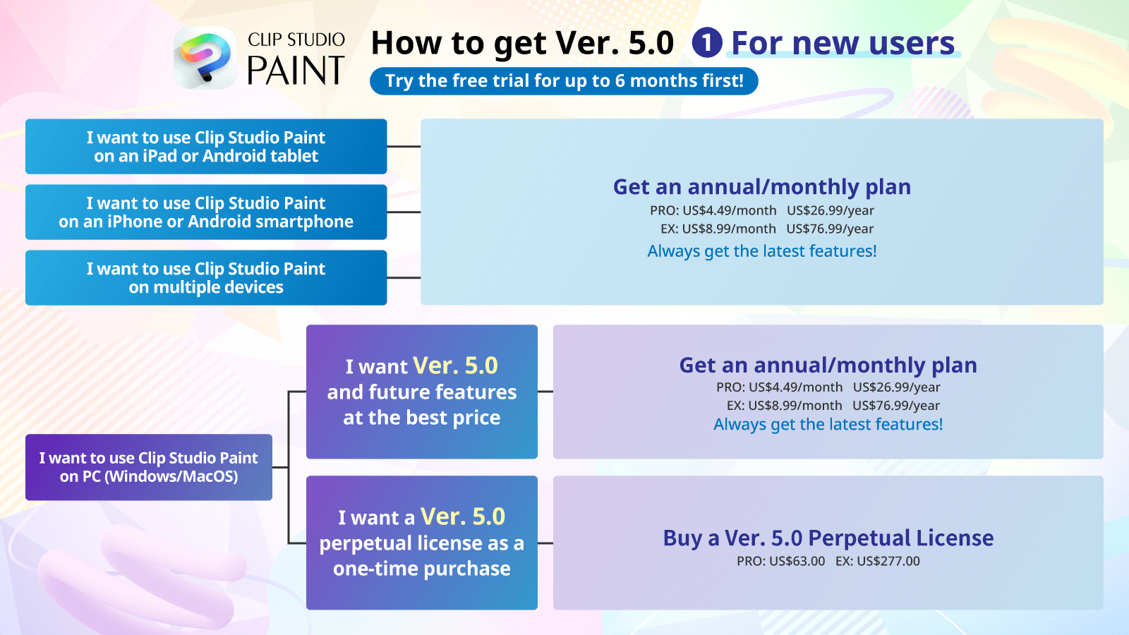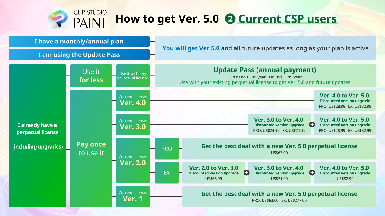 See here for the product lineup details. Check out the chart below to find the perfect plan for you to get Ver. 5.0, based on your current license and preferred payment method.