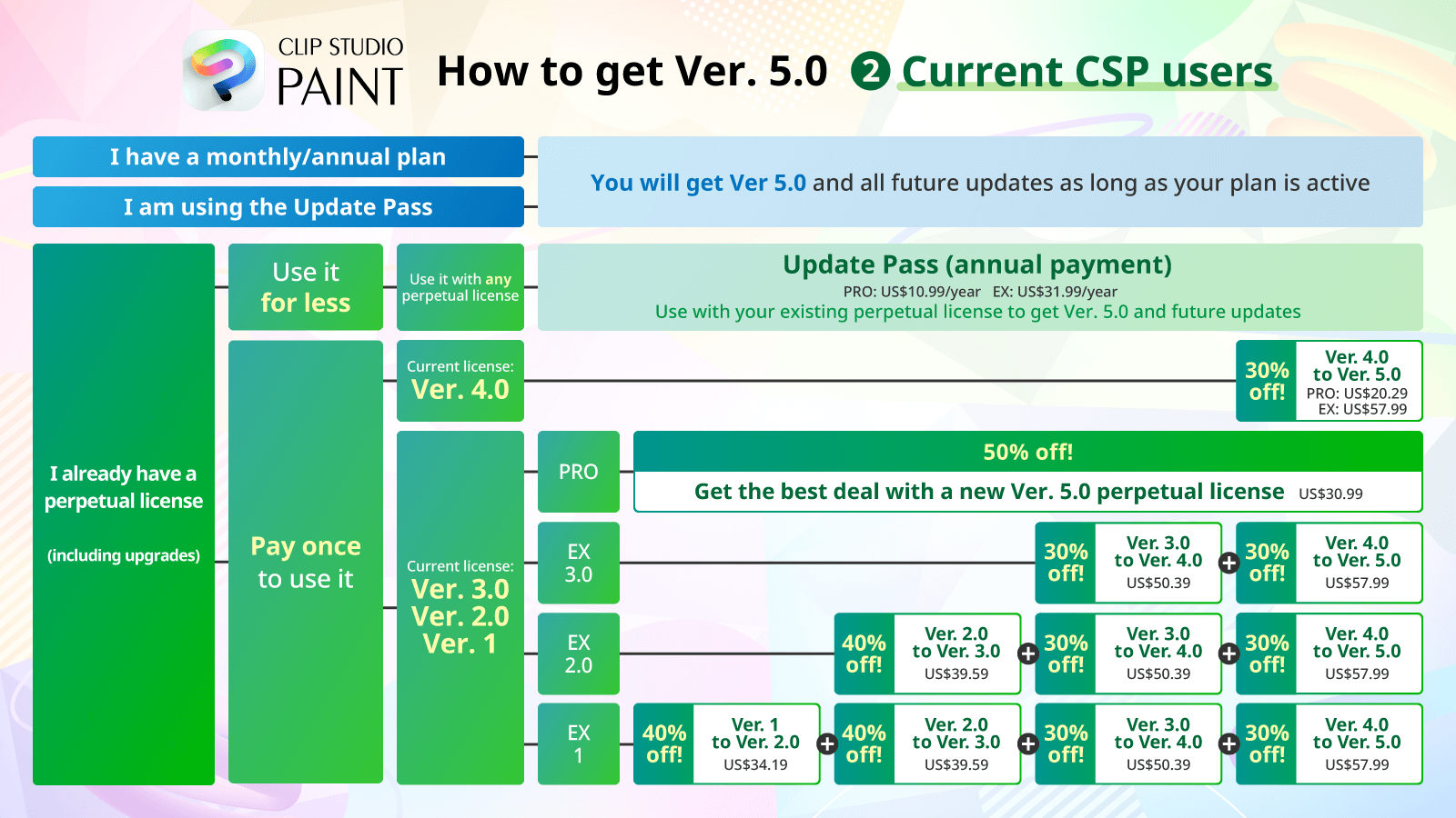 - We recommend that perpetual license users buy the Update Pass (annual payment) to access the latest versions at a lower price.