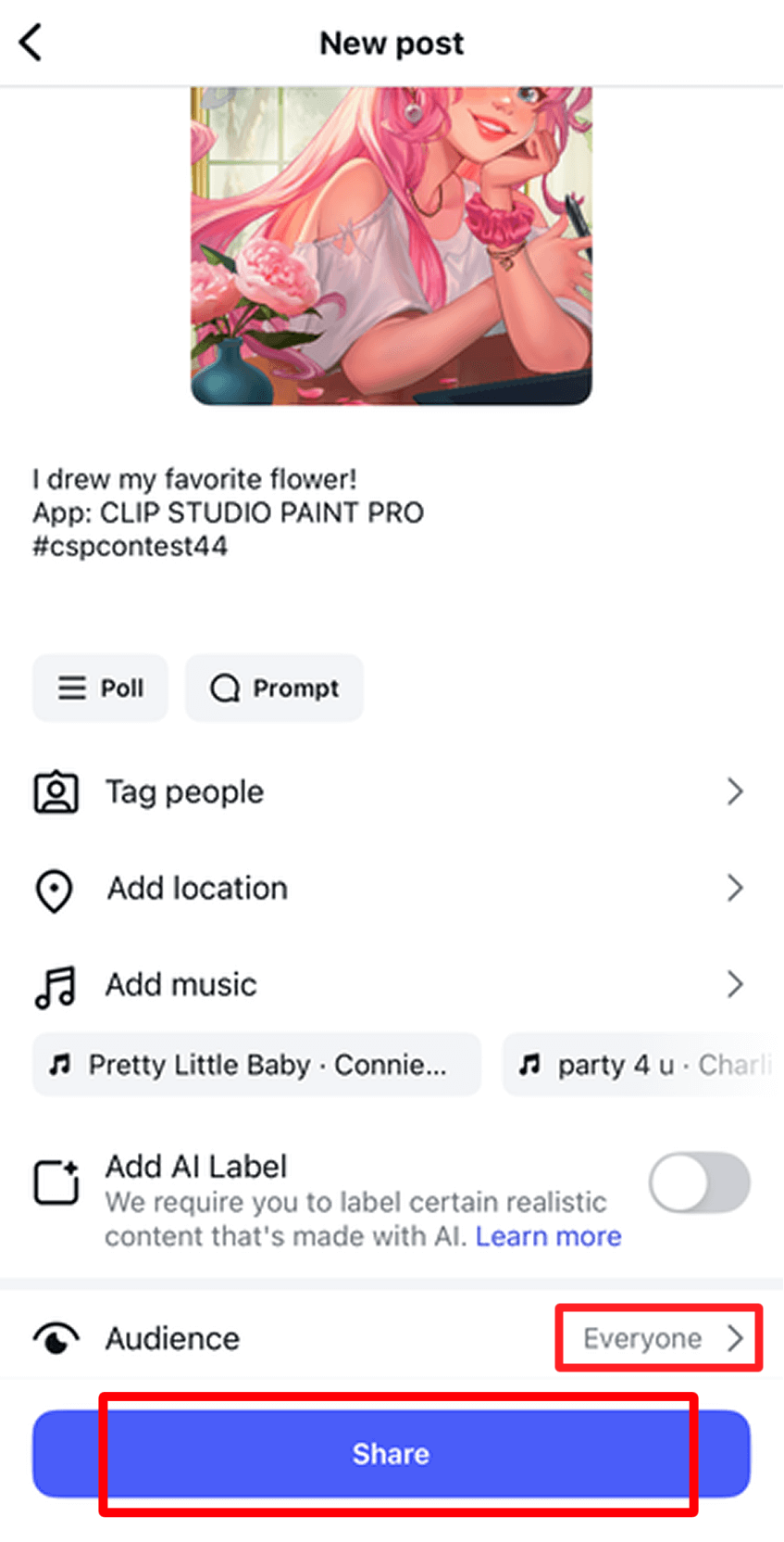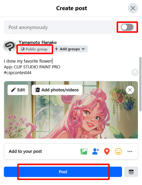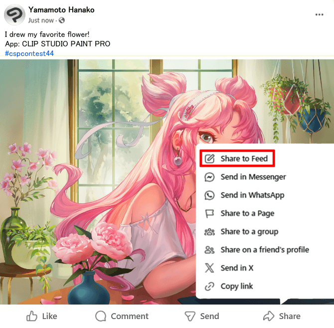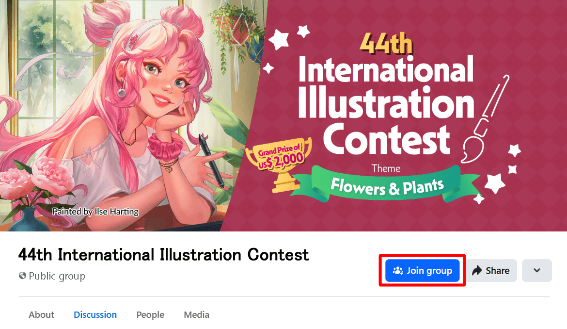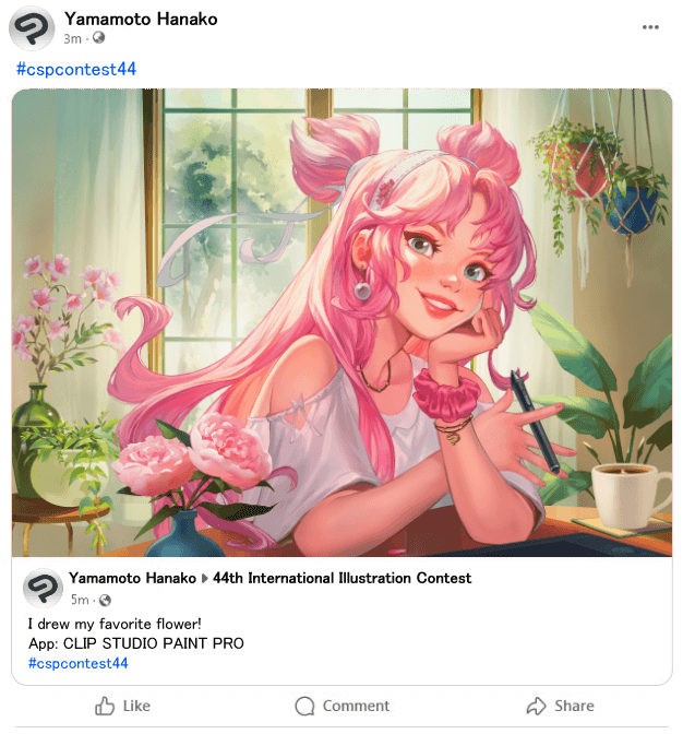 Sigue la página oficial de Clip Studio Paint (@celsys.clipstudiopaint) y publica tu ilustración con el hashtag #cspcontest44 en el grupo de Facebook creado para este concurso.