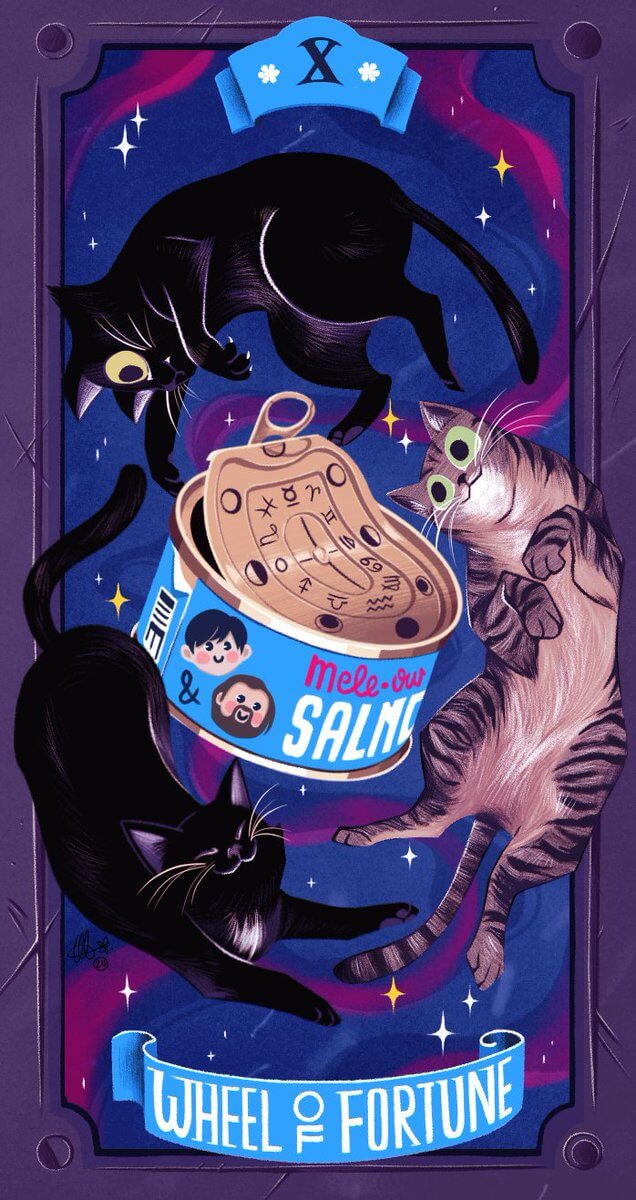 Cautivados por una lata de comida, estos adorables gatitos no pueden escapar de su destino, igual que en el simbolismo de las cartas del tarot. Su exuberancia inocente se retrata de forma juguetona y entrañable, con expresiones que parecen rogar unas cuantas caricias.