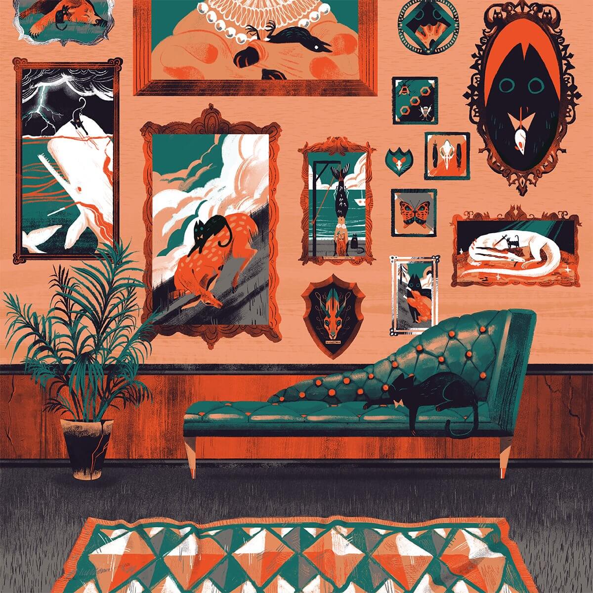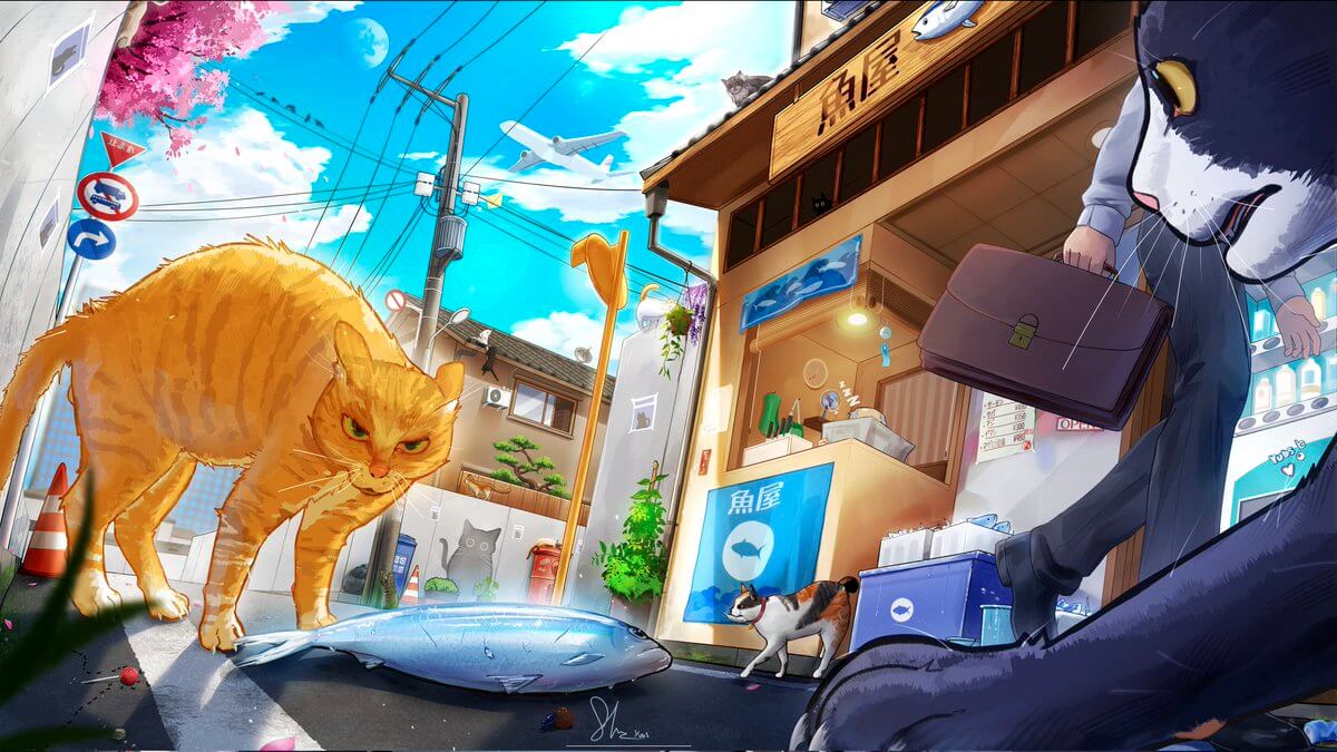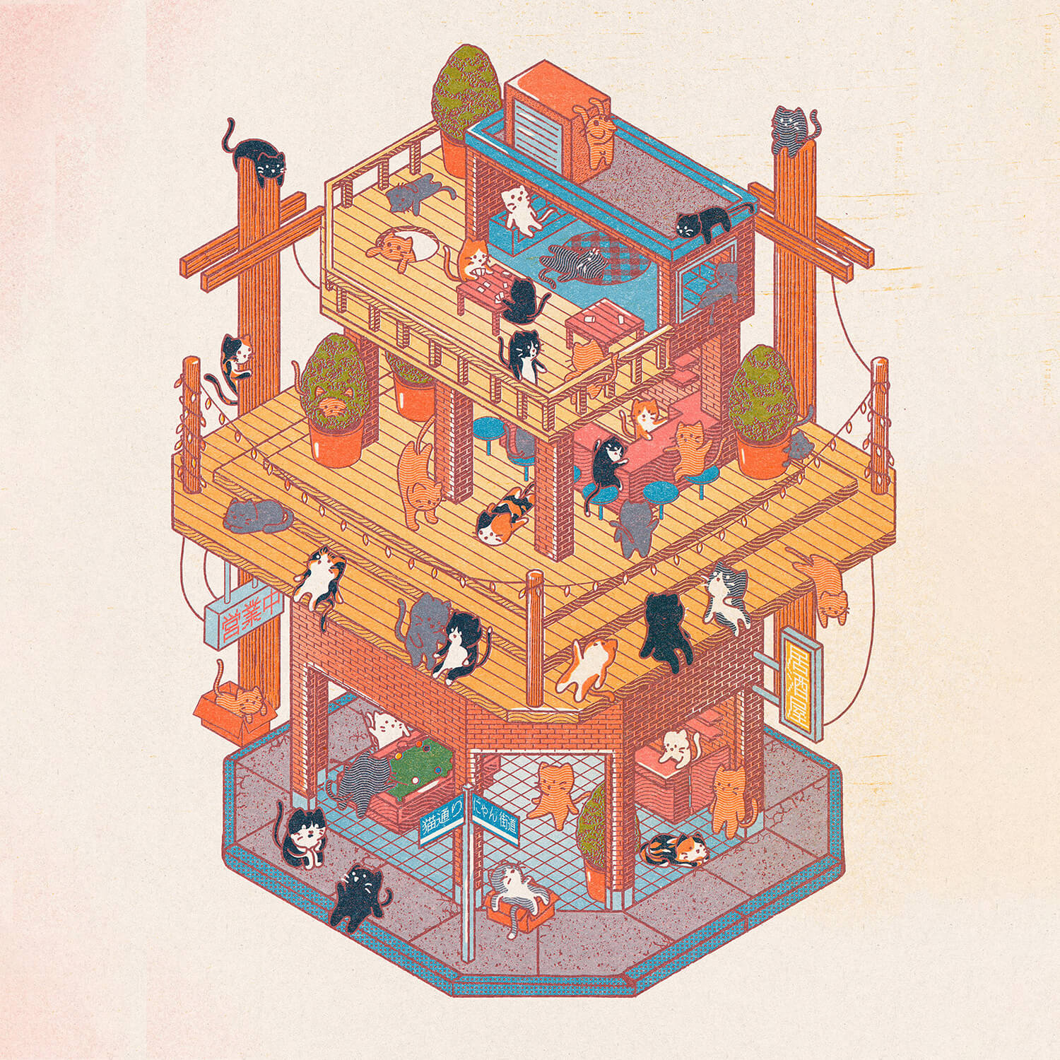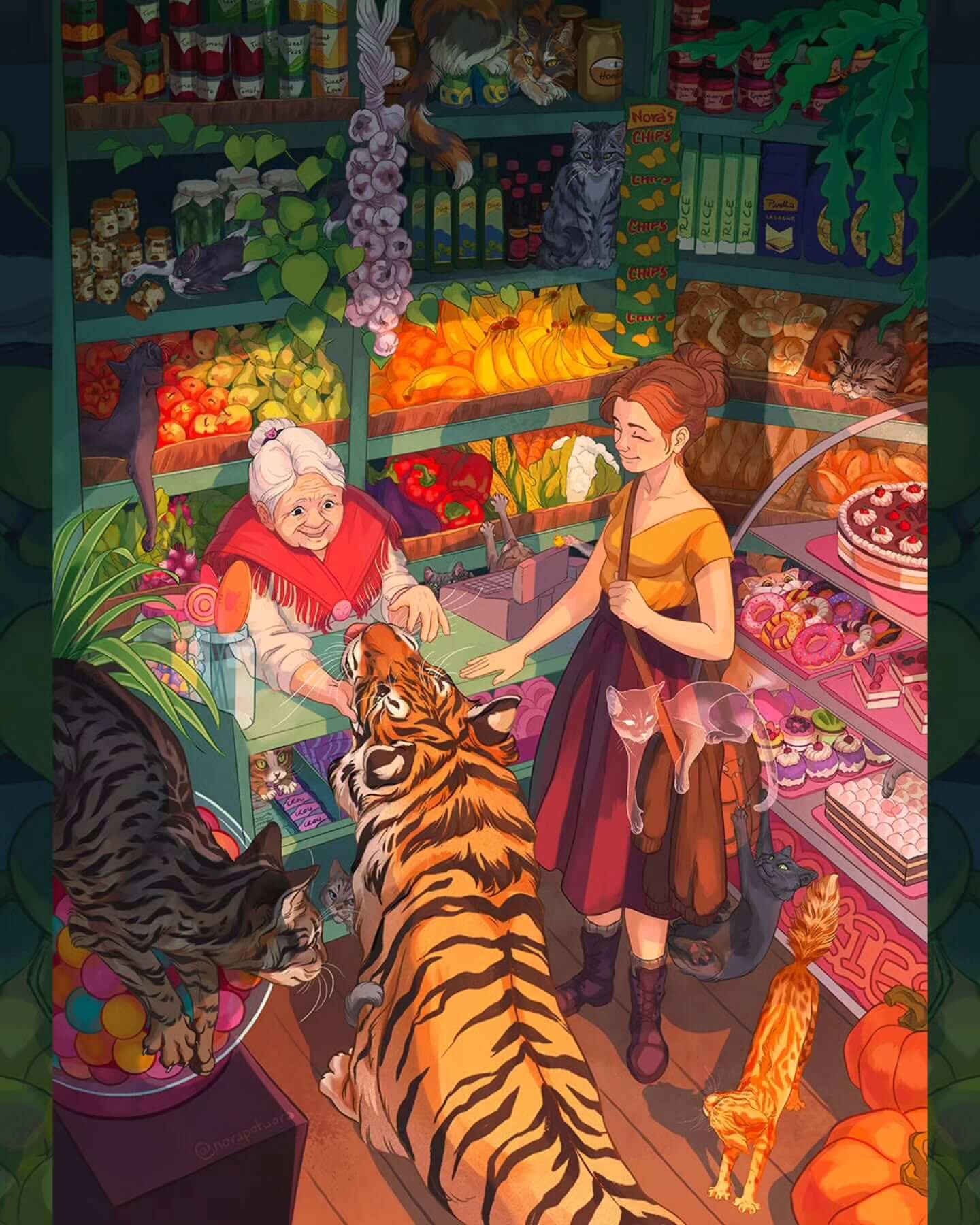 Si bien el majestuoso tigre acapara toda la atención en un primer vistazo, al observar con más detenimiento, podemos ver gatos escondidos por todos los rincones de la obra; el conjunto resulta un auténtico placer visual.