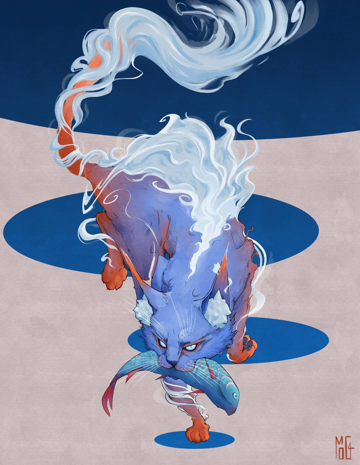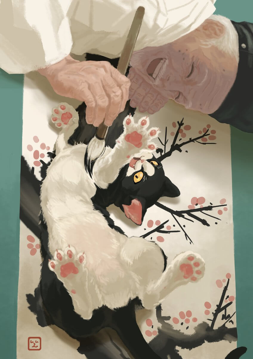 El archiconocido juego del gato y el ratón está representado con una energía desbordante. Con su sencilla composición, la obra logra expresar con ingenio y dinamismo la esencia misma de lo que significa ser un gato.