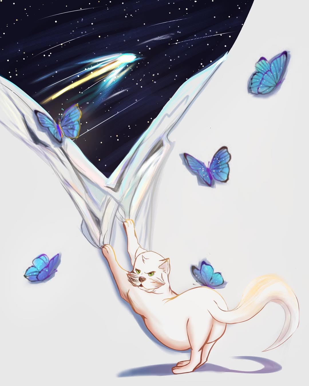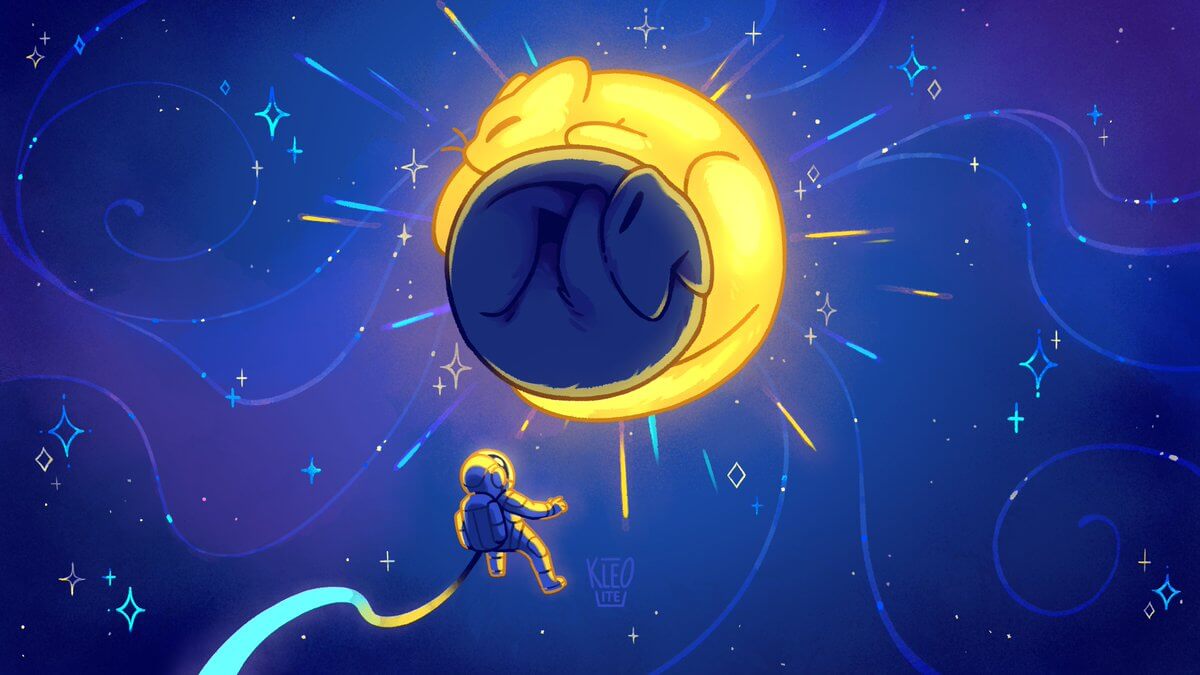 Nos fascina la idea tan creativa de una resplandeciente luna creciente formada por dos gatos cósmicos. ¡Nos encantaría ser astronautas capaces de aterrizar en ella!