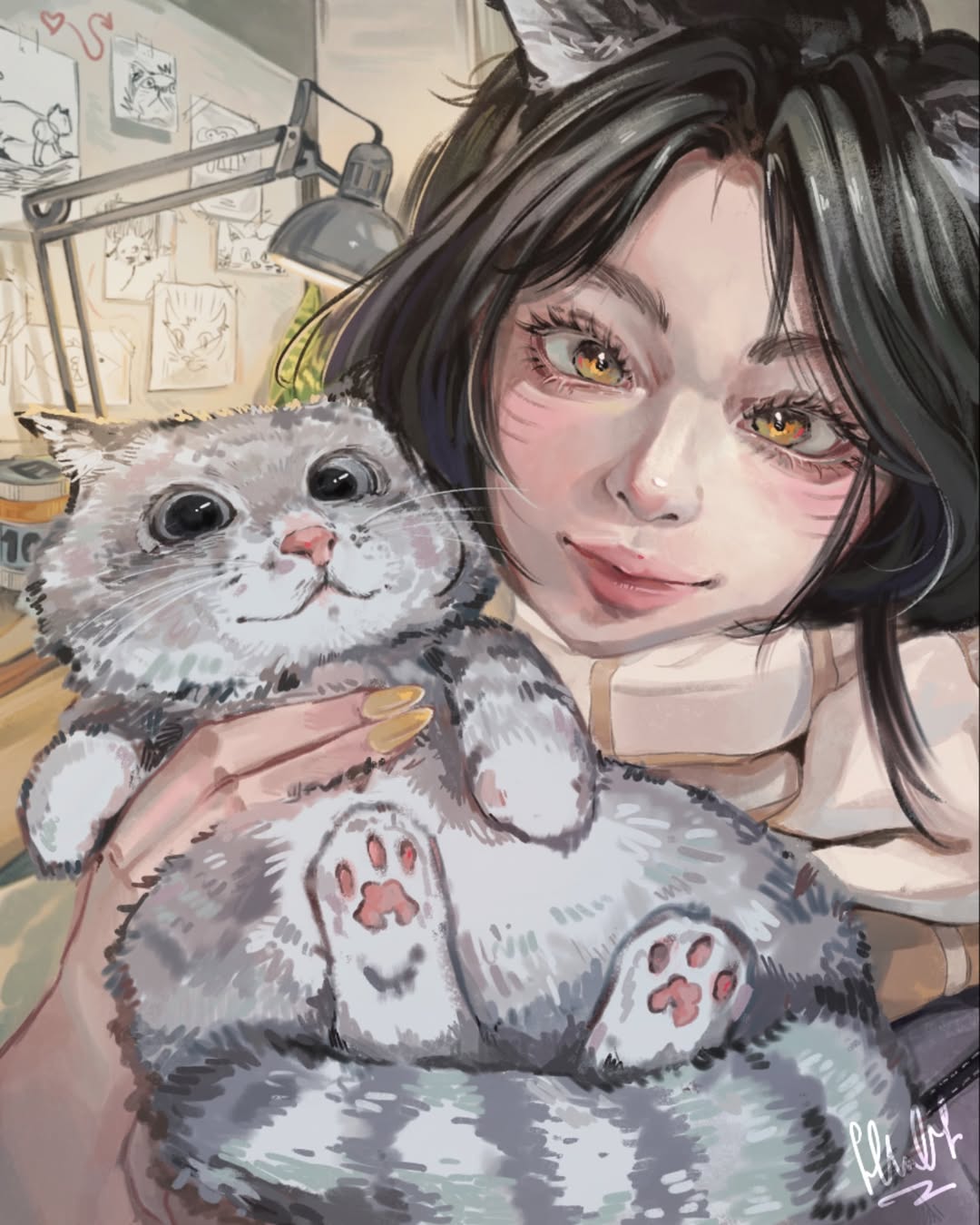 Nos encanta la idea de que las almohadillas de las patas del gato se fundan con las flores del cuadro. Tanto el hombre como el gato están representados con una vitalidad y una riqueza expresiva extraordinarias.