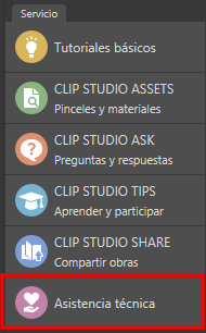 Puedes acceder directamente a CLIP STUDIO SUPPORT desde la pestaña “Asistencia técnica” que se encuentra en la lista de servicios del menú lateral.