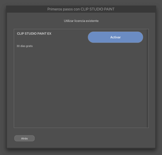 Ve al menú [CLIP STUDIO PAINT] > [Comprobar/cambiar licencia] > [Utilizar licencia existente] y haz clic en el botón [Activar] para acceder a los 30 días gratuitos de CLIP STUDIO PAINT EX.