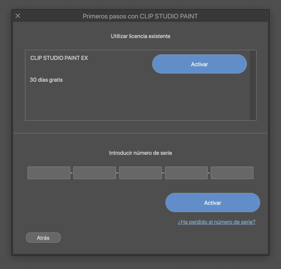 Ve al menú [Ayuda] > [Comprobar/cambiar licencia] > [Utilizar licencia existente] y haz clic en el botón [Activar] para acceder a los 30 días gratuitos de CLIP STUDIO PAINT EX.