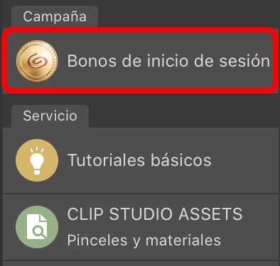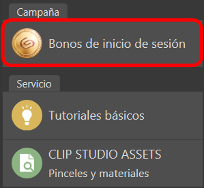 Después de iniciar CLIP STUDIO, toca o haz clic en "Bonos de inicio de sesión" en el menú de la izquierda para añadir las fichas Clippy a tu cuenta.