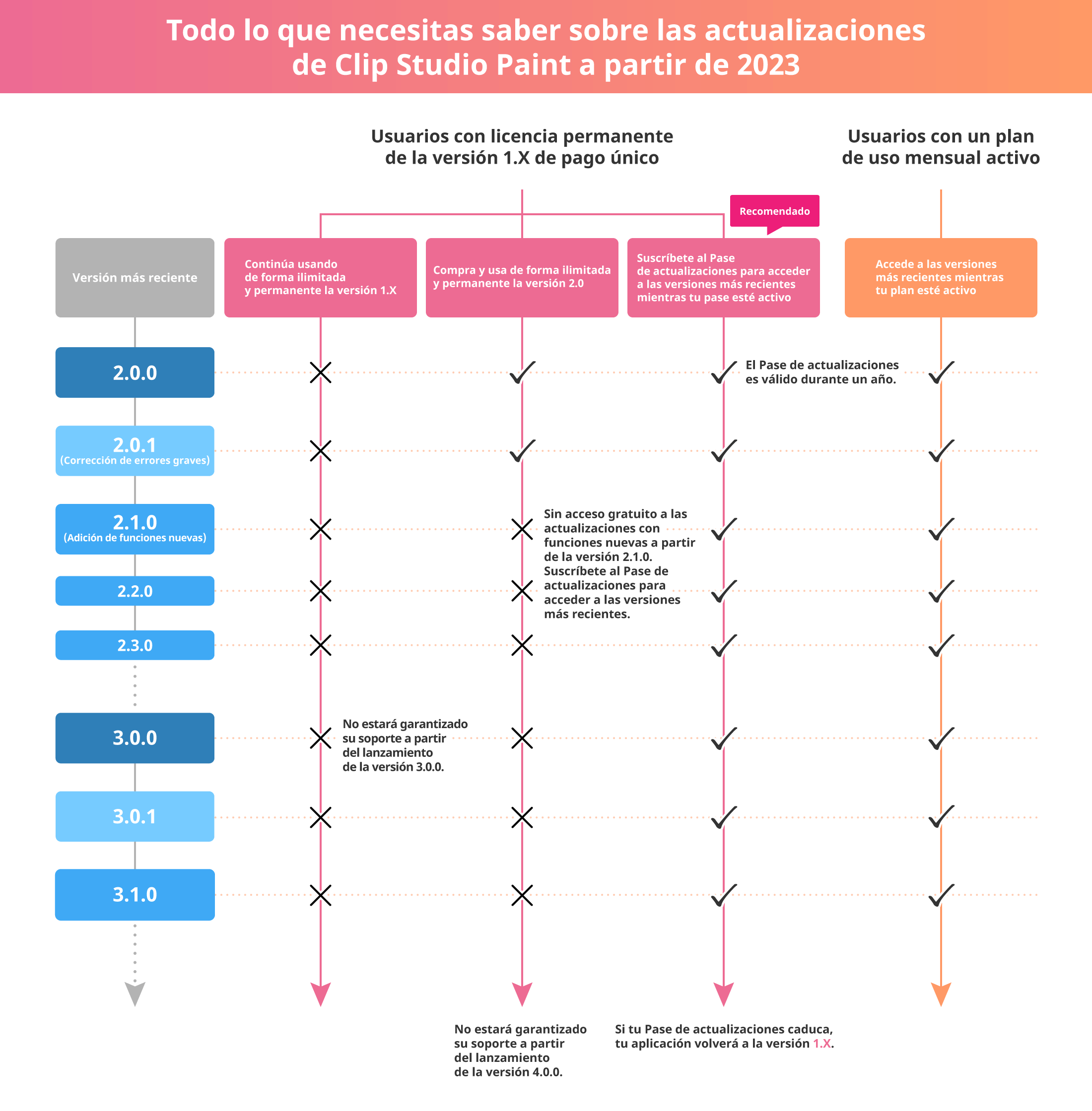 Mientras haya en vigor un plan de uso mensual (contratado mediante la página oficial de Clip Studio o tiendas de aplicaciones) o el mencionado Pase de actualizaciones, será posible utilizar la última versión del programa lanzada hasta el momento. Además, la versión 2.0 contará también con una edición permanente de pago único.