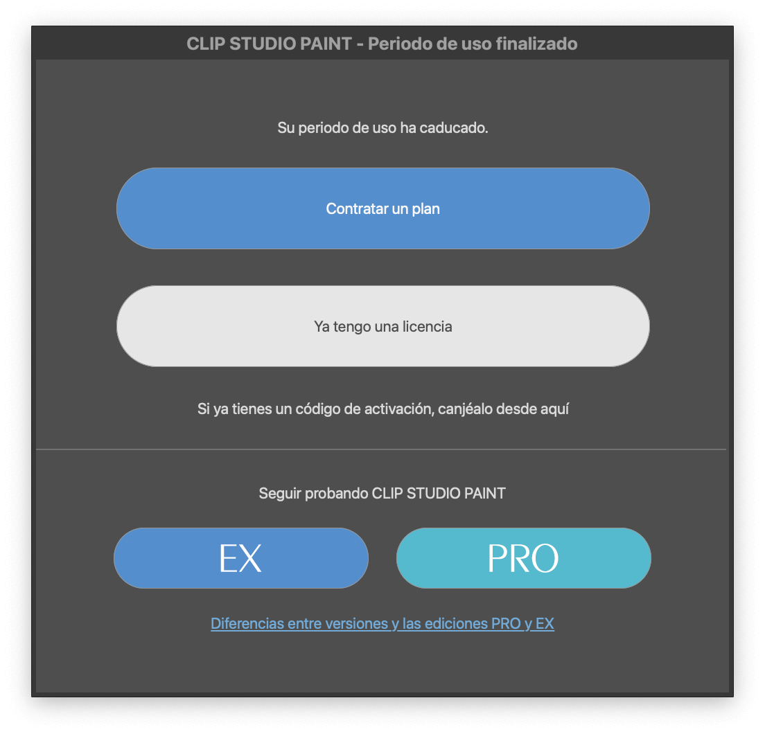 Si, tras suscribirte a un plan, sigue apareciendo el mensaje: "Su periodo de uso ha caducado" al abrir Clip Studio Paint, selecciona "Ya tengo una licencia", elige el plan que acabas de contratar y actívalo.