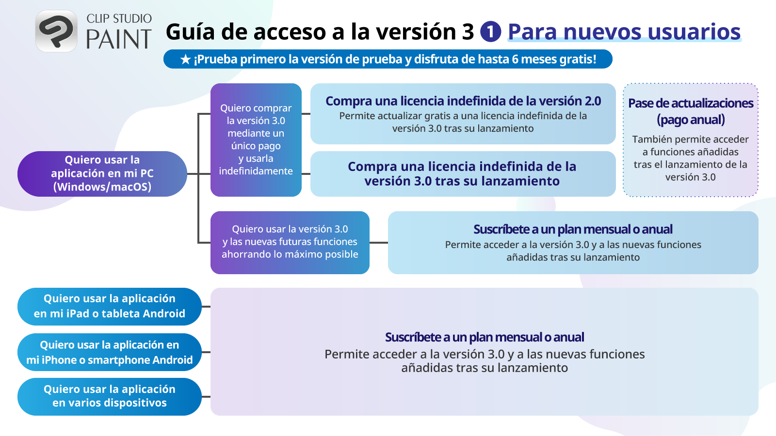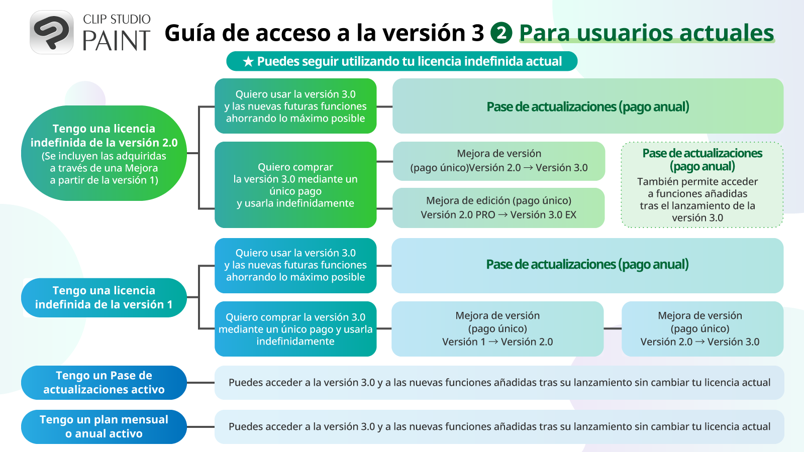 Los métodos disponibles para adquirir la versión 3.0 difieren en función de la licencia que se posea de Clip Studio Paint.