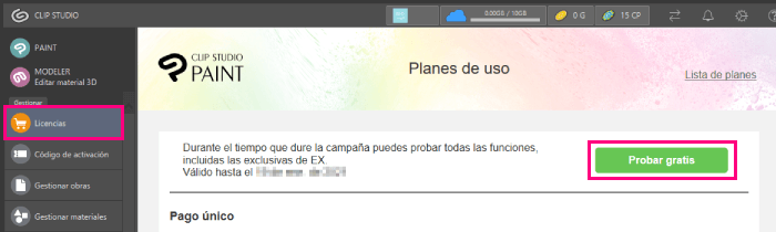 Abre Clip Studio y haz clic en el botón Licencias > Probar gratis.