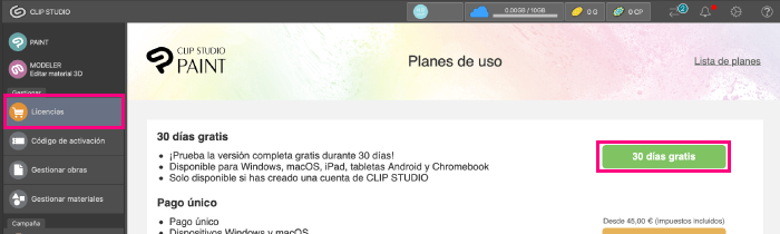Abre Clip Studio, ve a Licencias y haz clic en el botón de 30 días gratis.