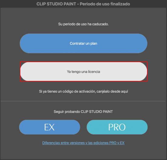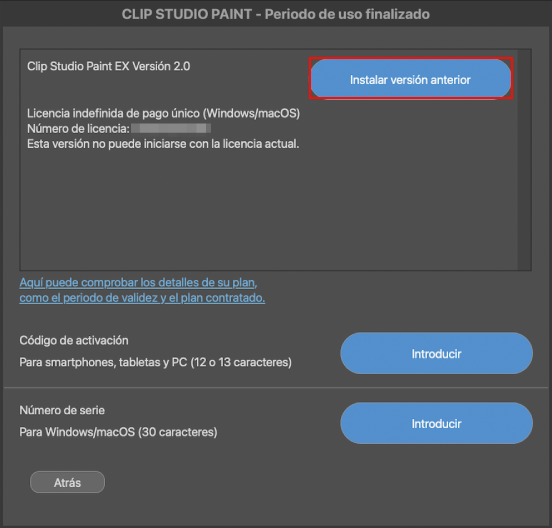 Al abrir Clip Studio Paint después de que haya terminado la promoción, aparecerá la siguiente ventana. Selecciona Ya tengo una licencia > Instalar versión anterior.