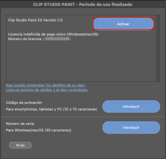 Ve al menú Ayuda > Comprobar/cambiar licencia > Utilizar licencia existente y haz clic en el botón Activar para acceder a los 30 días gratuitos de Clip Studio Paint EX.
