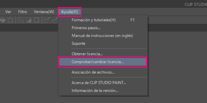 Ve al menú Ayuda > Comprobar/cambiar licencia > Utilizar licencia existente y haz clic en el botón Activar para acceder a los 30 días gratuitos de Clip Studio Paint EX.