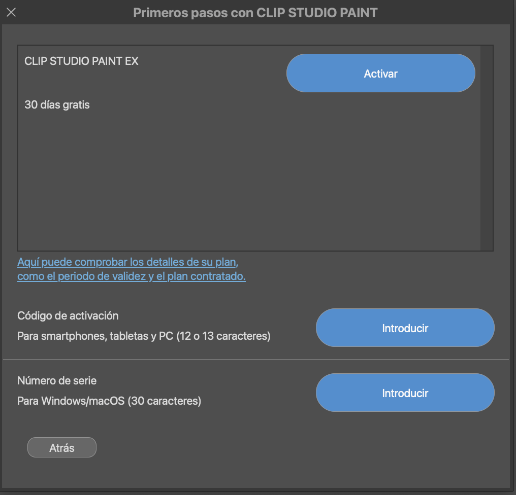Abre Clip Studio, ve a Licencias y haz clic en el botón de 30 días gratis.