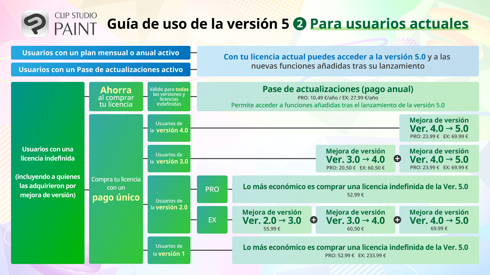 Los métodos disponibles para adquirir la versión 5.0 difieren en función de tu licencia actual de Clip Studio Paint.