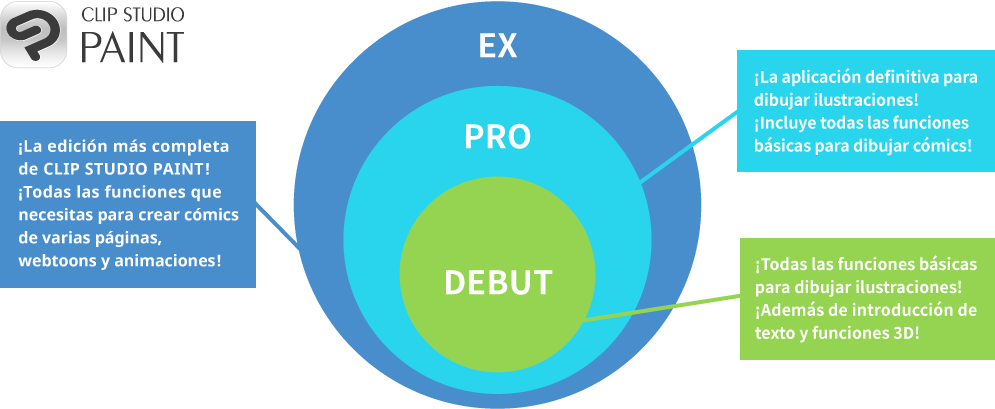 | Estilo manga | Crea cómics y mangas a todo color o en blanco y negro. Algunas funciones no están disponibles en DEBUT. | ✓ | ✓ | (✓) |