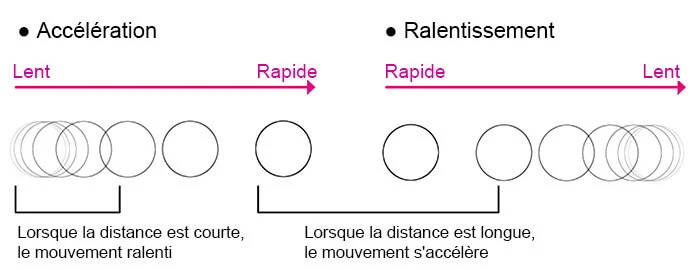 Vous pouvez exprimer cela dans l'animation en ajoutant plus de images au début et à la fin du mouvement. Les images étroitement espacées donnent l'impression d'un mouvement plus lent, tandis qu'un espacement large crée l'effet d'un mouvement rapide.