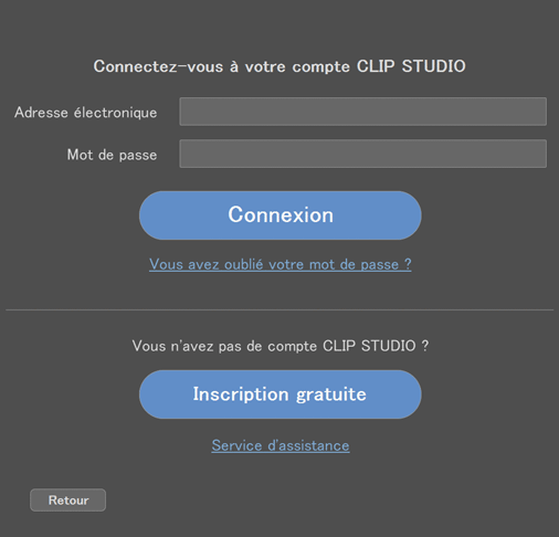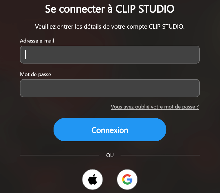 Votre compte CLIP STUDIO peut être lié à votre compte Apple ou Google. Pour plus d'informations, cliquez ici.