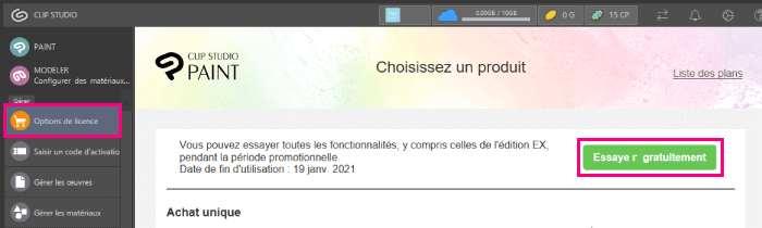 Démarrez CLIP STUDIO et cliquez sur le bouton [Options de licence] > [Essayer gratuitement].