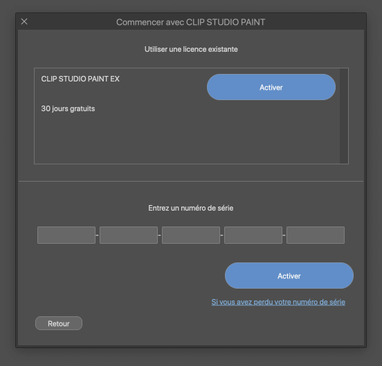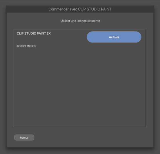 Cliquez sur le bouton [Activer] de la licence gratuite pendant 30 jours de CLIP STUDIO PAINT EX accessible à partir du menu [CLIP STUDIO PAINT] > [Vérifier/Changer la licence] > [Utiliser une licence existante].