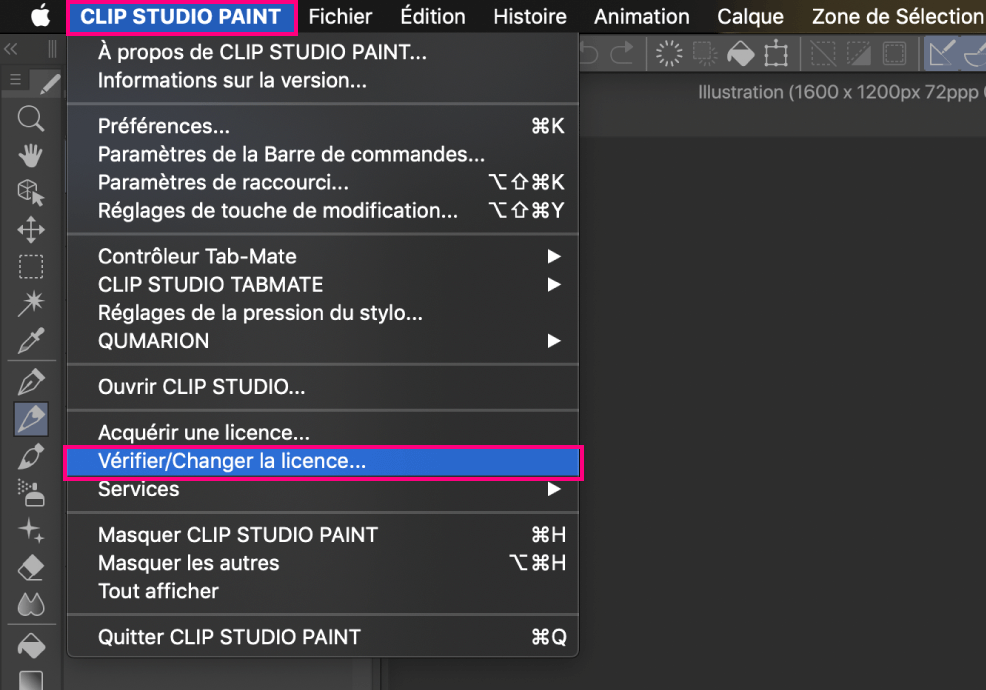 Cliquez sur le bouton [Activer] de la licence CLIP STUDIO PAINT PRO accessible à partir de [Vérifier/Changer la licence] > [Utiliser une licence existante].