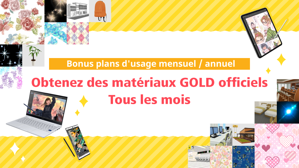 Nous offrons en cadeaux à tous les utilisateurs souscrivant aux plans d'usage mensuel et annuel « Plan Solo », « Plan Duo », « Plan Premium » ou « Plan Smartphone », ainsi qu’à tous les nouveaux utilisateurs souscrivant à un de ces plans, un cadeau mensuel de leur choix parmi les matériaux GOLD officiels publiés sur CLIP STUDIO ASSETS.