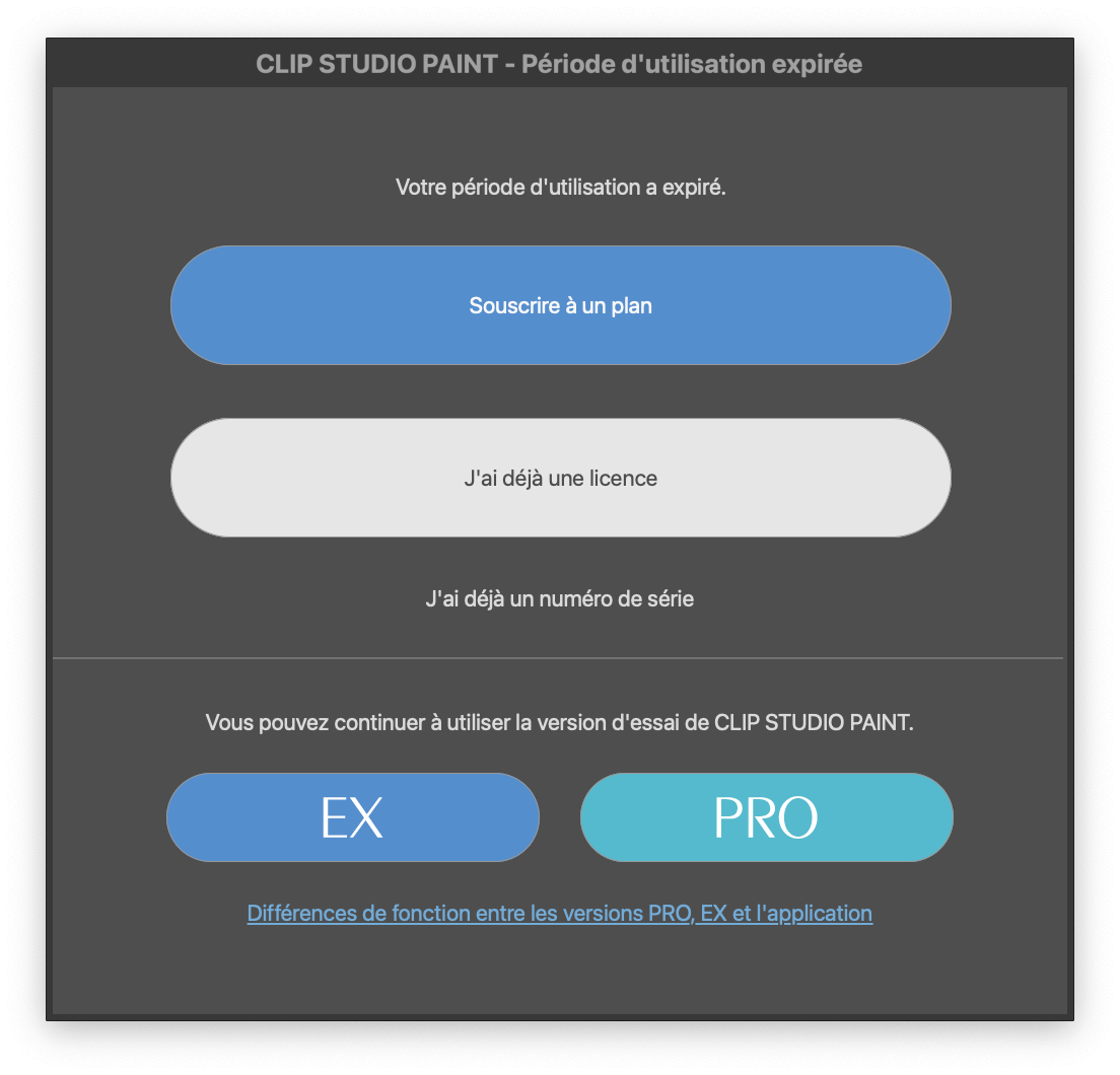 Si le message « La période d'utilisation a expiré » s'affiche lorsque vous démarrez CLIP STUDIO PAINT après l'application, veuillez sélectionner [J’ai une licence], sélectionnez le plan auquel vous venez de souscrire et démarrez l’application.