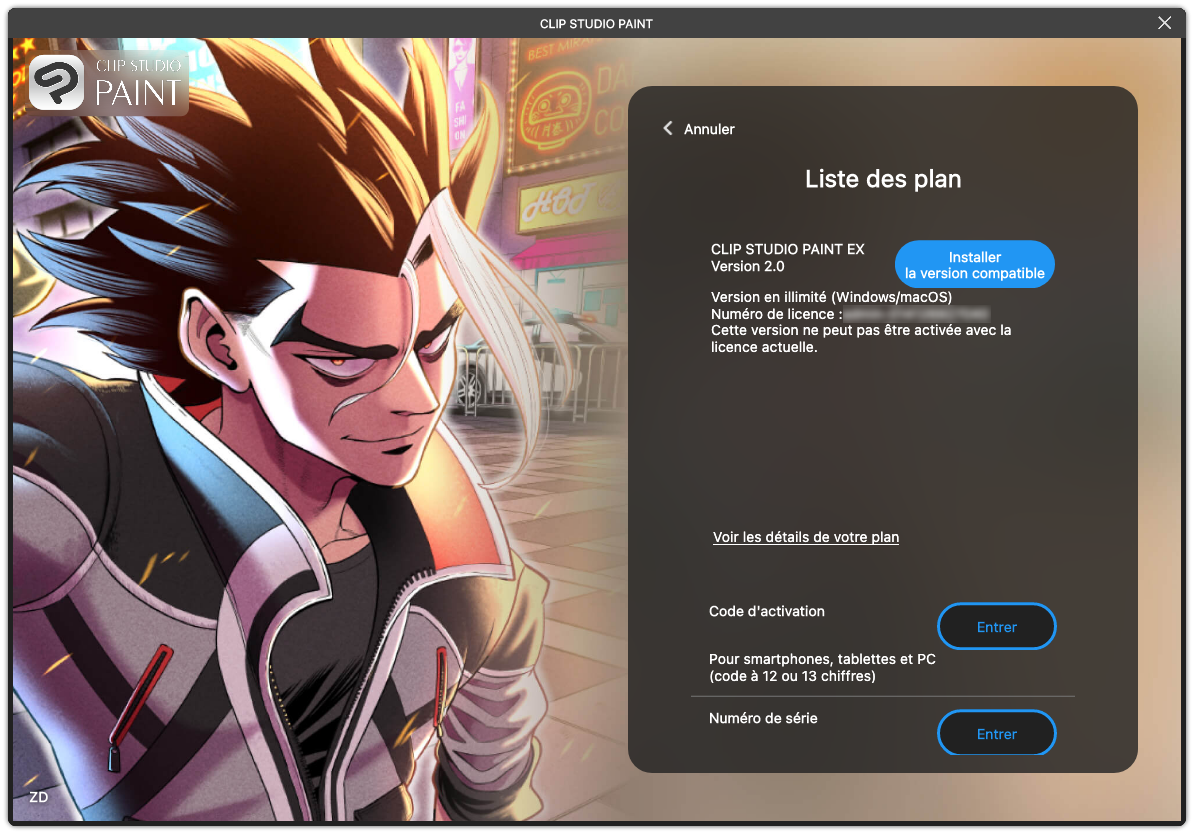 Suivez les instructions à l'écran pour réinstaller la version disponible avec votre licence. La même boîte de dialogue apparaît à nouveau, cliquez sur le bouton [J’ai une licence] → [Activer].