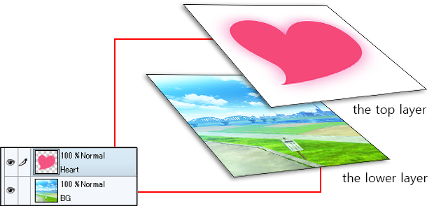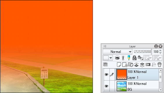 The blending mode of a layer is set to [Normal] by default. Anything drawn with 100% opacity will appear opaque, so the layer underneath isn’t visible. You can change how the colors blend with lower layers by changing the blending mode.