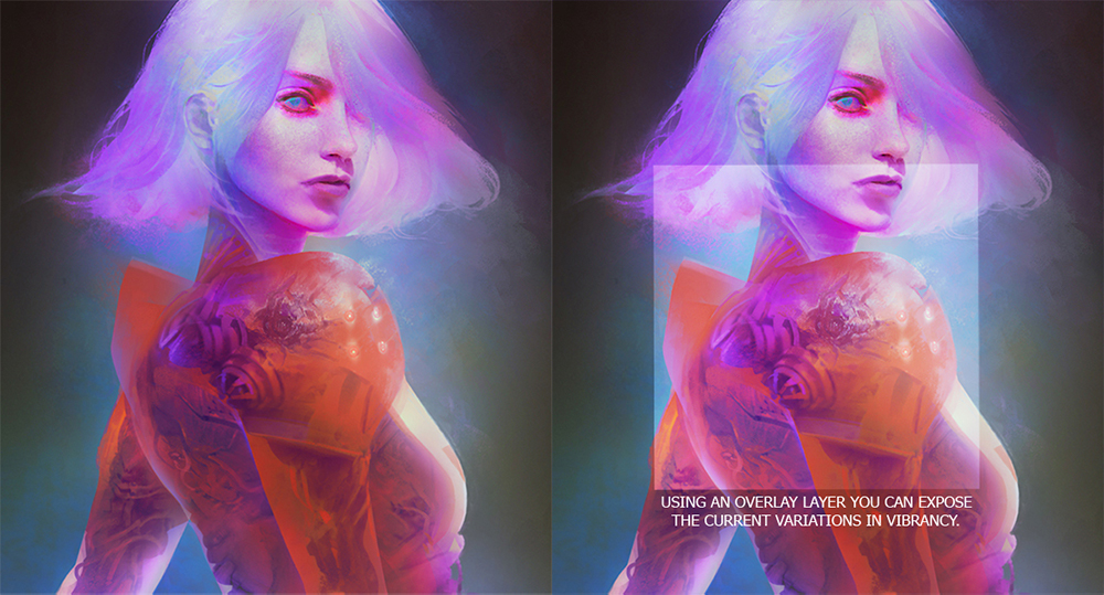Vibrancy in digital media can be summarized as simply as this: When you are painting, your uppermost layers should always be the ones with heavy colors on them. The stronger the color and color percentage on those top layers, the more the painting will stand out and fluctuate in contrast. Considering this rule right after your composition is an important step that will positively affect your rendering and color choices naturally as time goes by.