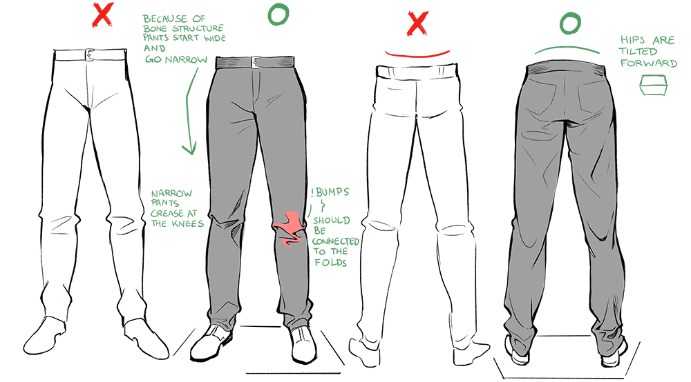 Be careful of the forms that the pant legs create when the leg moves.