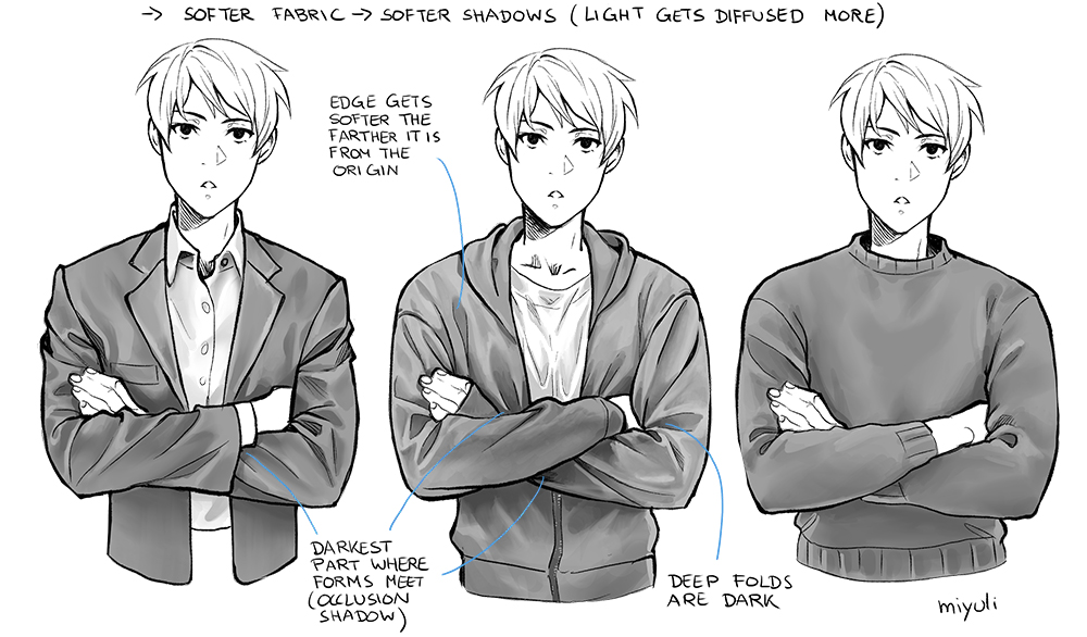 It is very important to consider the materials that you draw when dealing with folds. They all have their very own characteristics that help to decide where to put the appropriate folds. Their texture dictates how diffused the shadows are.