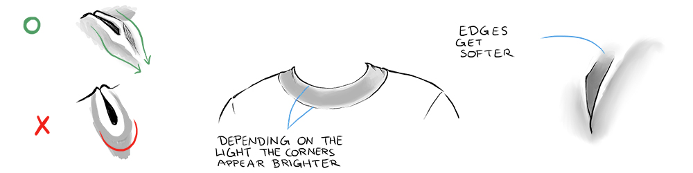 When shading folds, it’s good to use a combination of soft and hard edges.