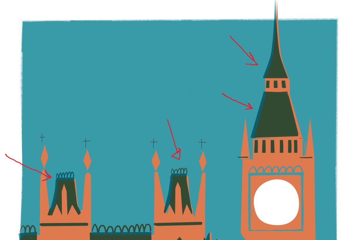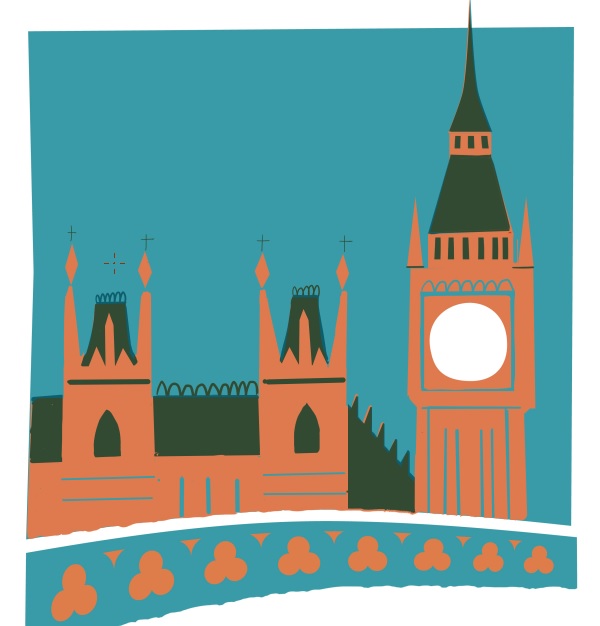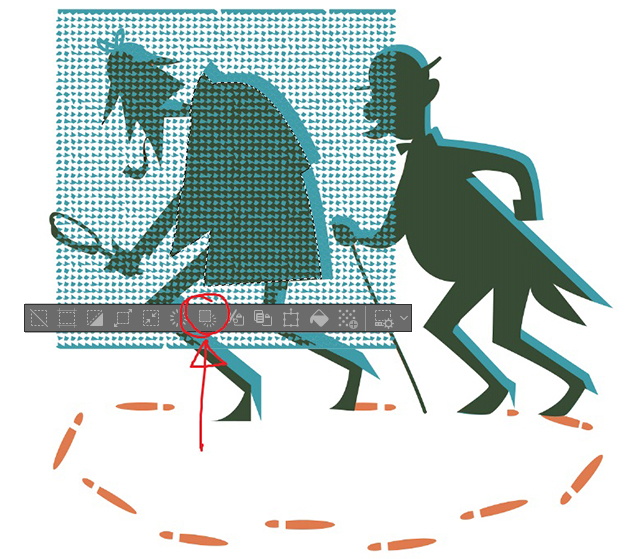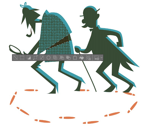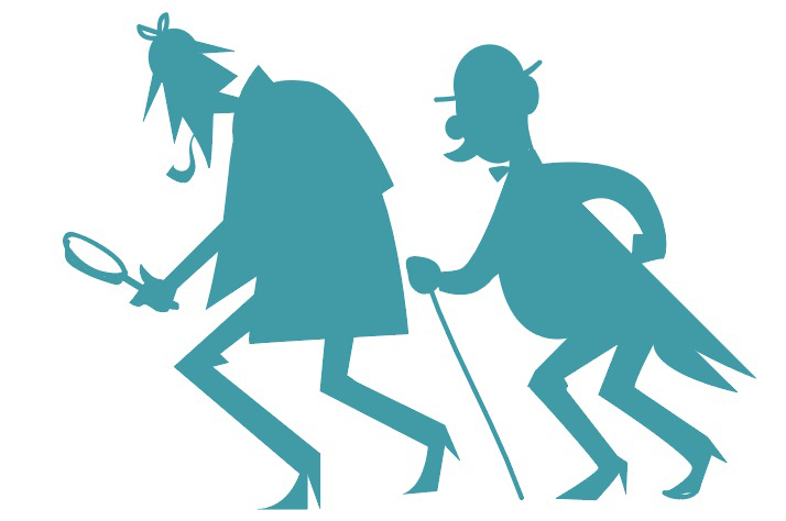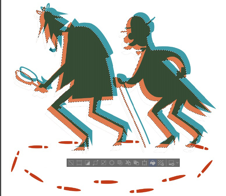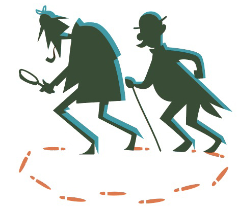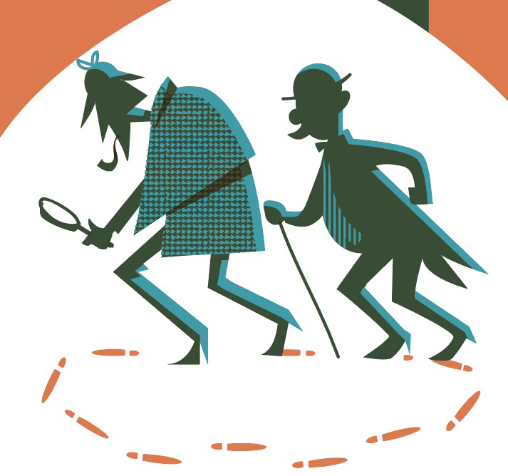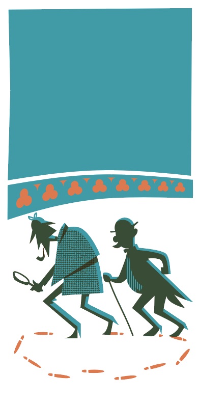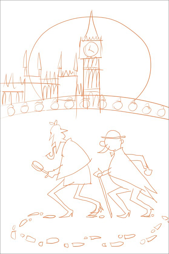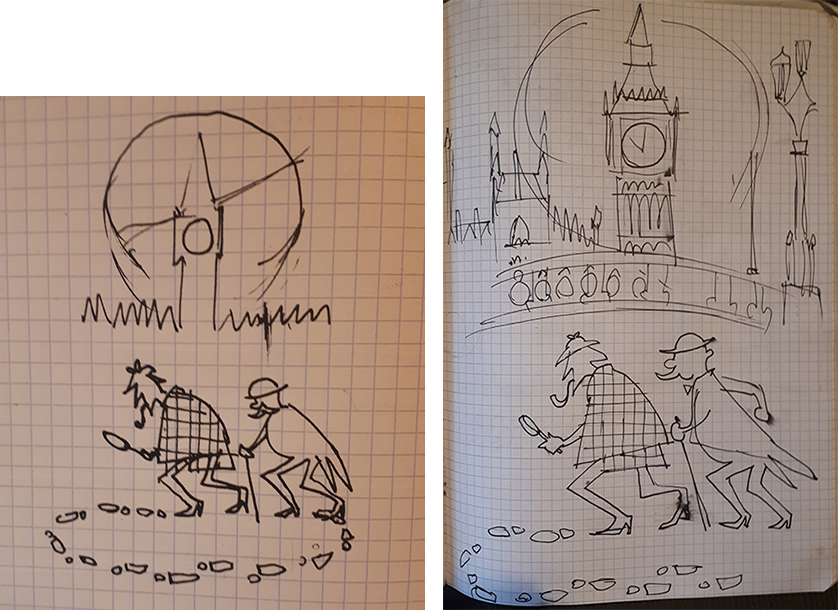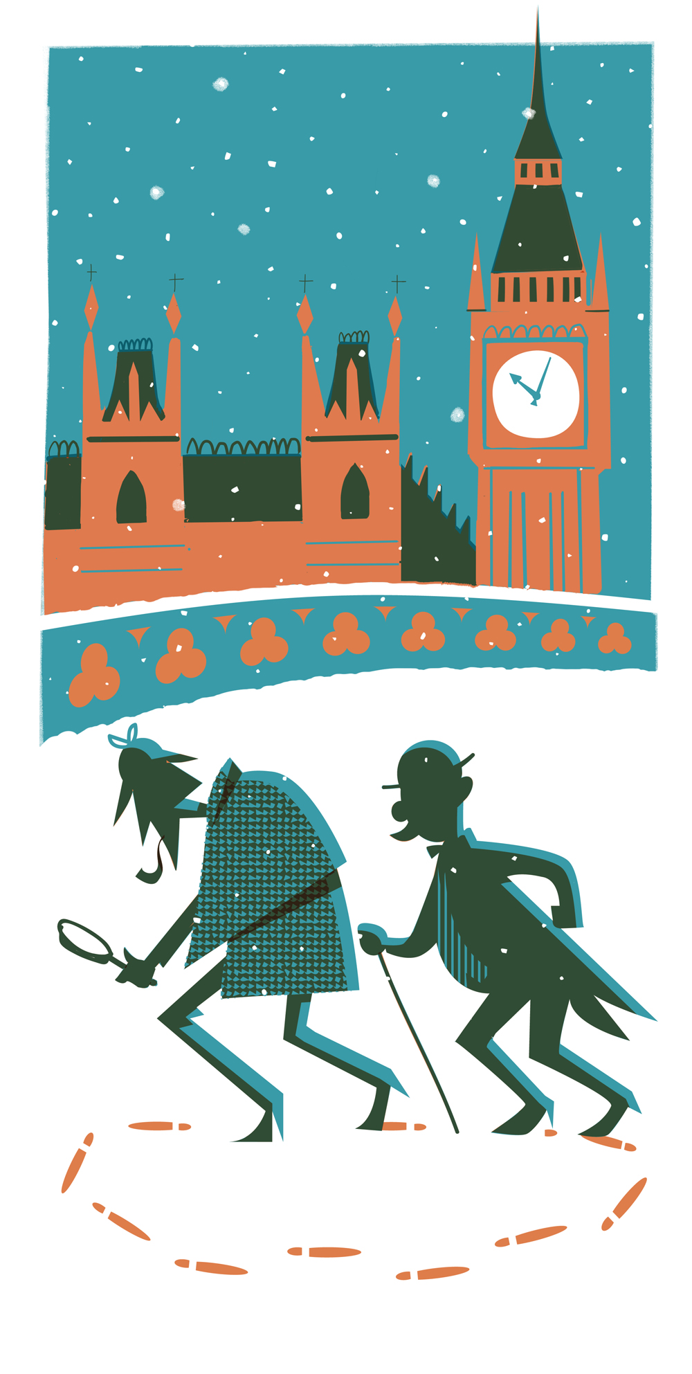 The illustration shows a well-known pair of detectives, looped along the trail of their own footsteps in the snow. Is there anything better than a gag? In the background, Big Ben and the Houses of Parliament set the scene in London. The idea of the snow came to me only after thinking that the characters would stand out better as silhouettes on a white background.