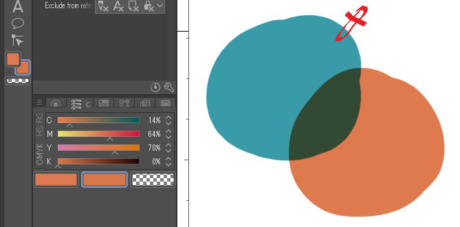 Using the Eyedropper tool, you can see a CMYK or RGB value from Window > Color slider. Once our two colors are defined, we can easily choose them with the dropper, and paint with them.