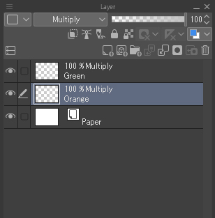 We will create a monochrome layer for each of the two colors. Using Layer > New raster layer, I create two new layers and set their blending mode to Multiply. In one layer, I paint with orange, and in the other, with green.