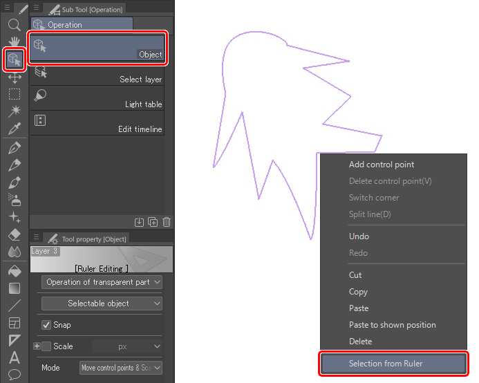 Using the Object tool, select the new shape, and create a selection area by right-clicking and choosing Selection from ruler. A dotted line will then surround the selection.
