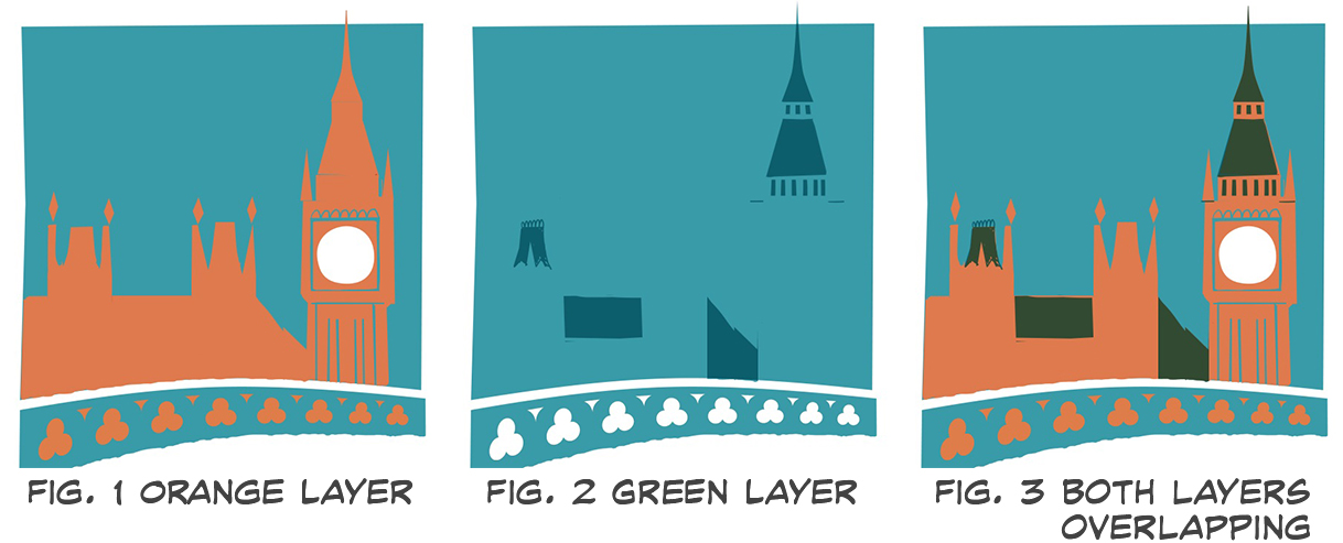 We can digitally mimic this printing process by keeping each color on a separate layer and then setting their Blending Mode to Multiply. (Fig. 3)