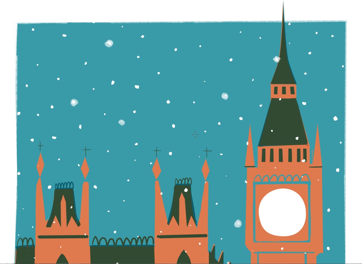 For the snow, I have created a new raster layer and painted the white snowflakes using the Pen and the Real Pencil tools. As the final artwork will be digital, I did not follow the only-two-layer rule. If we want to respect the rules of this printing game, we should create the flakes by erasing directly on the monochrome layers. If you want to try that, select all the flakes of the white layer (Layer palette > Ctrl+Click on the layer) and delete that selection from both monochrome color layers.