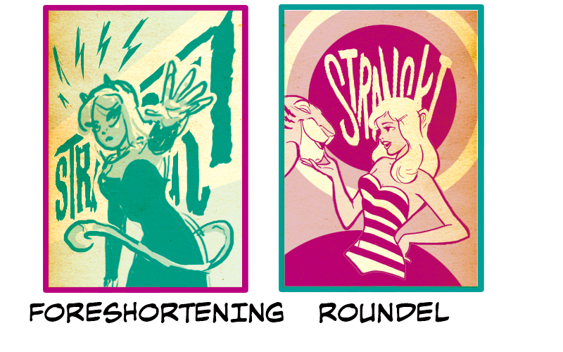 Foreshortening & Roundel are also compositionally similar in how the character is placed: hips up half body facing forward on an angle. The logos are also the same in that they are integrated into each cover’s composition in a way that works with the figures and elements around them. Foreshortening’s logo follows the line of action that goes through the character’s extended arm. The tail coming around the front and the lightning bolts are also good ways to balance out negative space above and below the character & logo combo. Roundel’s character and logo combo complement each other in terms of contrast and design. The logo is also somewhat obscured by the character’s head, which makes you take both of these elements together.