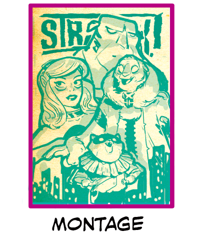 Montage is probably one of the more recognizable compositions in this batch, as it is commonly used for comic book covers. However, it’s worth noting some of the techniques that make this composition work. The composition includes three main elements: a logo at the top, characters in the middle, and an environment at the bottom. The characters are the focal point and are surrounded by bold lines to set them apart from the other elements. Note how the bold lines also separate each character. This can communicate that while all of these characters are in this city, they are not necessarily on the same team. Also, note how the camera angle each character is drawn from also differs further separating them. In Montage, the logo is present but is treated as the background and partially obscured by the central figures.