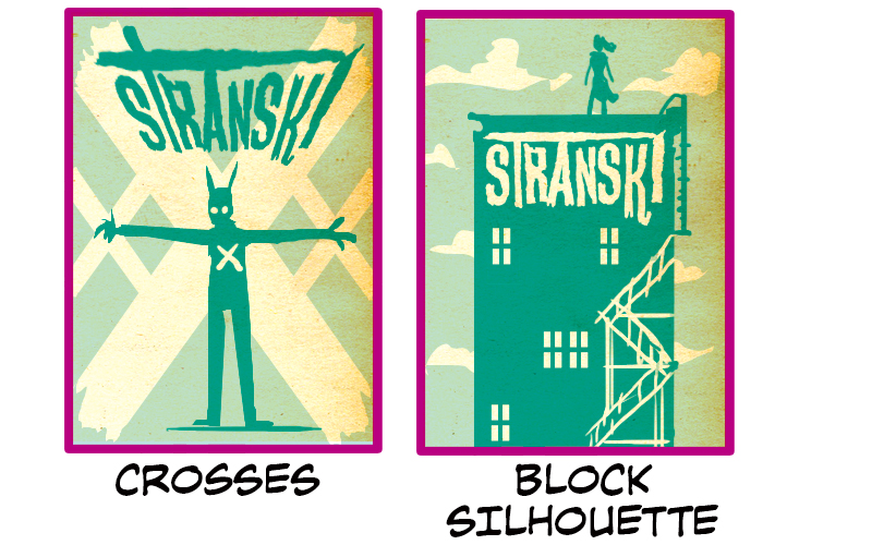 Crosses & Block Silhouette are examples of simplified silhouette compositions. Crosses has an abstract element (a cross) echoed in both the background of the cover and the pose of the central figure. It’s a vague enough symbol that can be applied to many elements of a story, especially when a character is at a crossroads. Notice that the logo is stretched to fit the angles of the cross element as well. In Block Silhouette shows a composition that many comic book cover creators are no stranger to, the dark figure on top of a building. Again, note how the logo is integrated into the design of the cover and helps to balance out and complement the overall composition.
