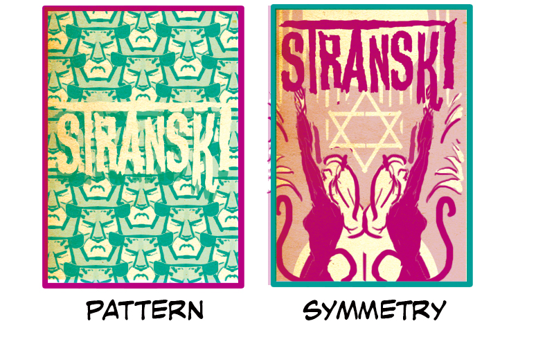 Pattern and Symmetry are good decorative alternatives to traditional cover motifs. Seamless repeating patterns can be quite busy, so the logo in Pattern is simply in white. This helps it not distract from the pattern but also stand out enough to be readable. Symmetry allows for a more traditional comic book cover that includes figures as in the other examples. Still, it keeps the decorative touch found in Pattern while offering something visually different to your audience.
