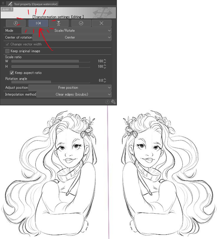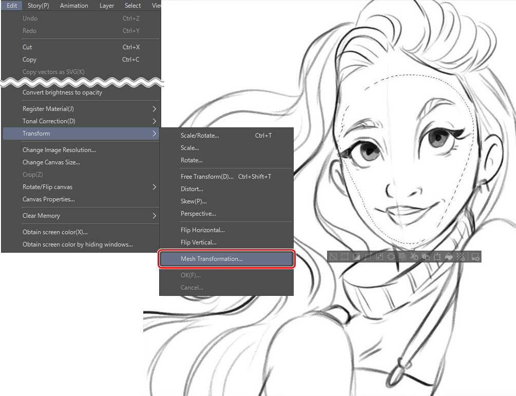 When doing the sketch, I like to use some tools to adjust the drawing to my needs, like the flip canvas horizontally, the transform tool, and mesh transformation. They help me to get the correct proportions and view of my portraits. Mesh transformation can be found here (Edit menu > Transform > Mesh Transformation).