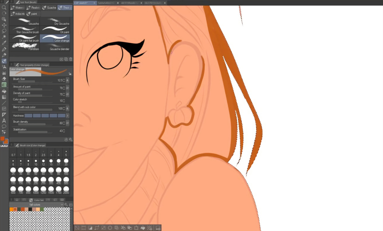 For coloring, I used the Clip Studio Paint present brushes, like the Mapping pen and the Oil Paint brush for color blocking, which fits perfectly with my needs. For basic shadows, I ended up using the Smooth Watercolor brush, which is perfect for this soft effect I am working for in this illustration.